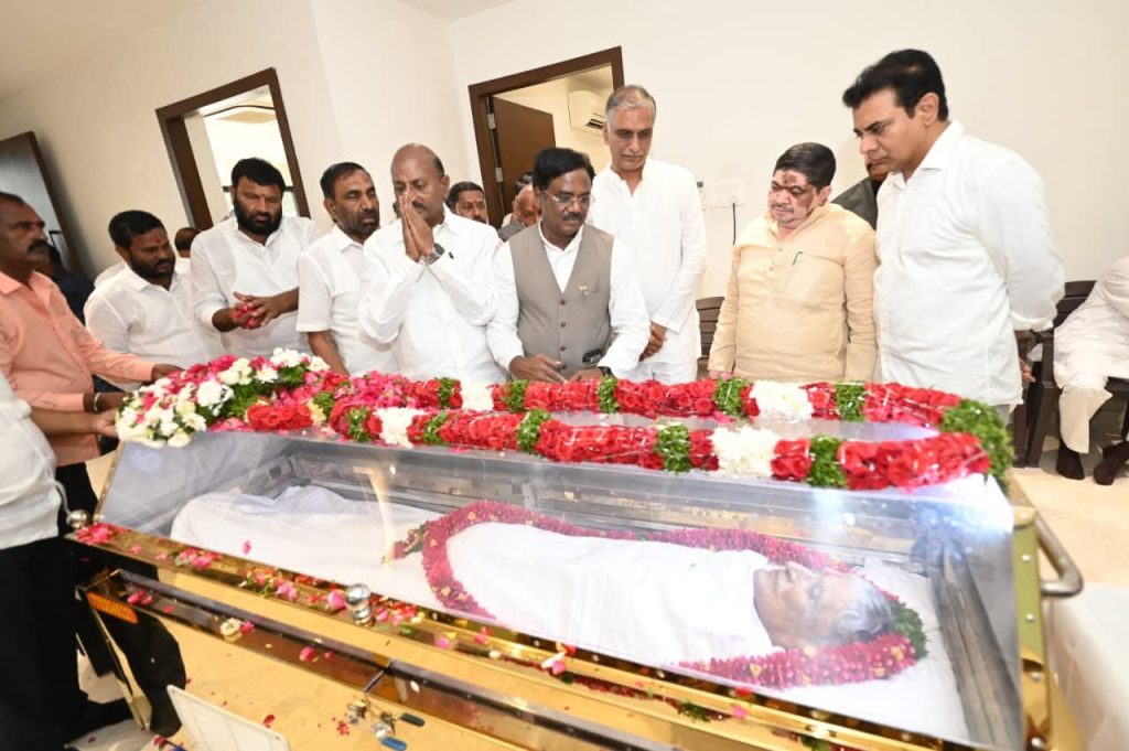 ప్రతిపక్షం స్టేట్​బ్యూరో, హైదరాబాద్, అక్టోబర్​28: మాజీ మంత్రి, సిద్దిపేట ఎమ్మెల్యే తన్నీరు హరీష్ రావు తండ్రి సత్యనారాయణ మృతి చెందారు. హైదరాబాద్​లోని హరీష్​రావు నివాసంలో సత్యనారాయణ పార్థీవ దేహాన్ని ఉంచారు. కేసీఆర్, కేటీఆర్ తో సహా భారత రాష్ట్ర సమితి నేతలు సత్యనారాయణ పార్థీవ దేహానికి నివాళులు అర్పించారు. ఈ సందర్భంగా హరీష్​రావును, తన సోదరిని ఓదార్చిన కేసీఆర్​తన బావ సత్యనారాయణతో ఉన్న అనుబంధాన్ని గుర్తు చేసుకున్నారు. ఫిలింనగర్​మహా ప్రస్థానంలో ఆయన అంత్యక్రియలు నిర్వహిస్తున్నారు. పార్టీ నేతలు గంగుల కమలాకర్, రసమయి బాలకిషన్, జగదీశ్వర్​రెడ్డి, సంతోష్, పాడి కౌశిక్​రెడ్డి, బాల్క సుమన్, శ్రీనివాస్​గౌడ్, పద్మారావు గౌడ్, దేవపతి శ్రీనివాస్, దాస్యం వినయ్​భాస్కర్, మధుసుదనాచారి, రాకేష్​రెడ్డి, గుత్తా సుఖేందర్​రెడ్డి, వద్దిరాజు రవించంద్ర, బీజేపీ నేతలు కేంద్ర మంత్రులు కిషన్​రెడ్డి, బండి సంజయ్, ఎంపీ రఘునందన్​రావు, కొండా విశ్వేశ్వర్​రెడ్డి, రాష్ట్ర మంత్రులు వివేక్​వెంకటస్వామి, పొన్నం ప్రభాకర్ తదితరులు సత్యనారాయణ పార్థీవ దేహానికి నివాళులర్పించారు. కాగా కేసీఆర్​కుటుంబమంతా ఉదయం నుంచే హరీశ్ ఇంటి వద్ద చేరుకున్నారు. స్వయంగా తన మామ అయిన సత్యనారాయణ అంత్యక్రియలకు కవిత దూరంగా ఉండడం చర్చనీయాంశమైంది.